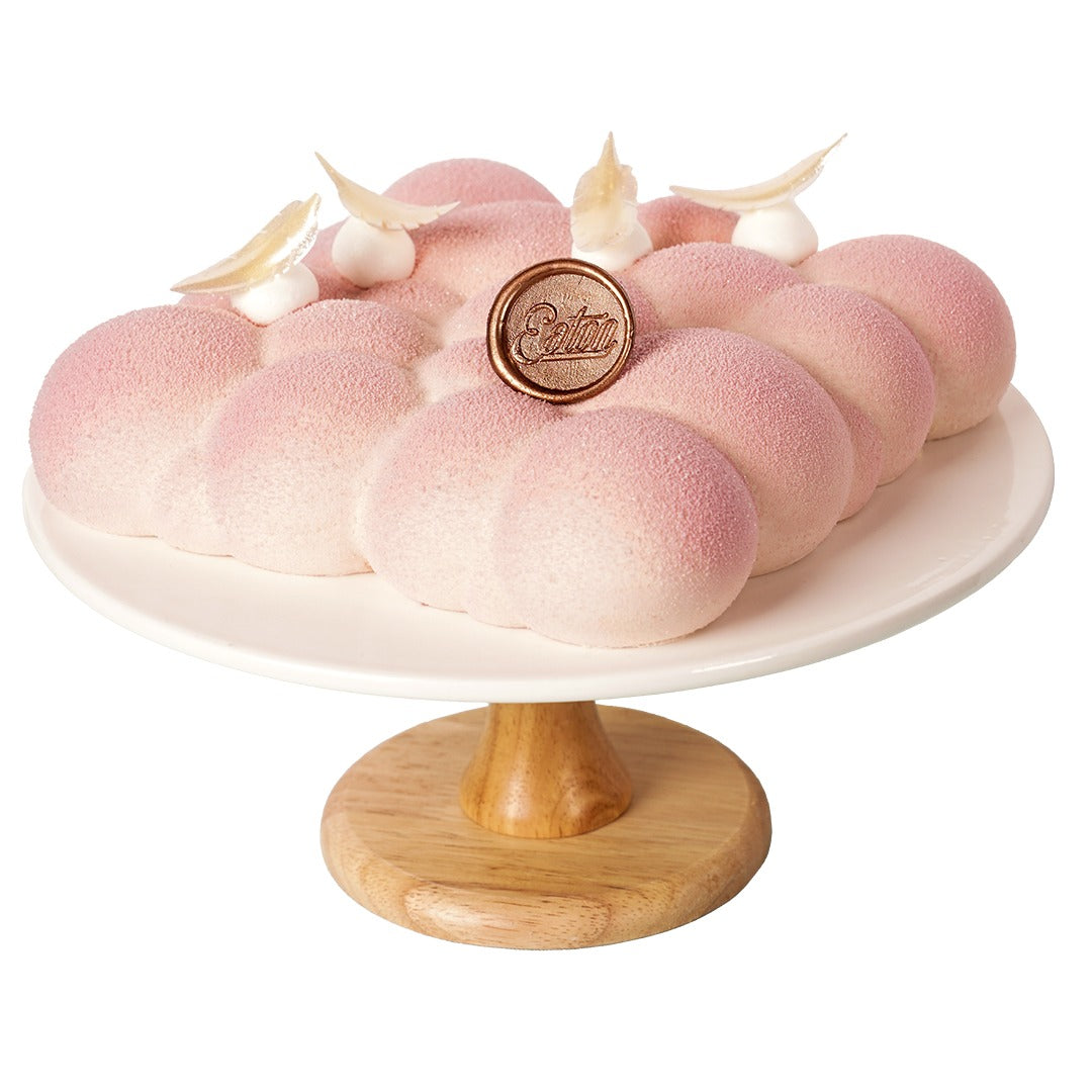 造型夢幻的白桃慕絲蛋糕,嚴選日本白桃製作,白桃慕絲下內藏海綿蛋糕、日本白桃果凍及果蓉,融合了多重口感。頂層以輕巧的羽毛朱古力片作裝飾,造型簡潔優雅。